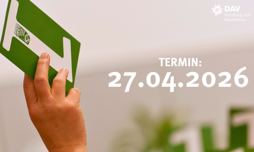 Einladung zur ordentlichen Mitgliederversammlung des Deutschen Alpenverein Hamburg und Niederelbe e.V. am Montag, den 27.04.2026. Beginn 18:00 Uhr, Einlass ab 17:30 Uhr im Haus des Sports (Alexander-Otto-Saal), Schäferkampsallee 1, 20357 Hamburg.